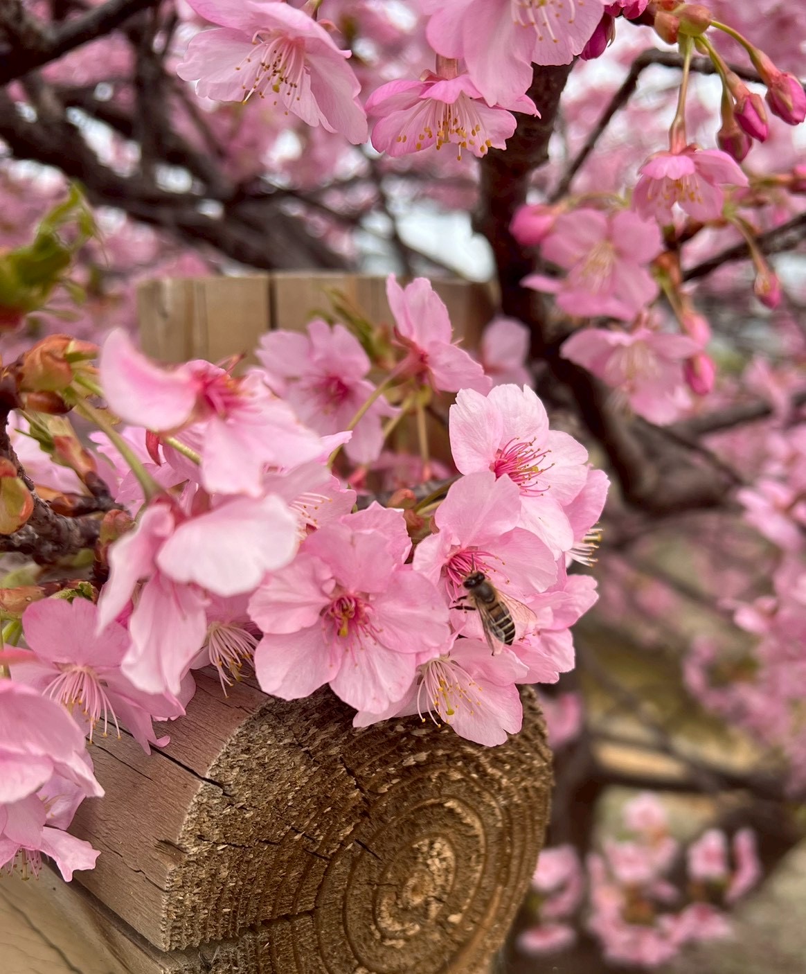 枝いっぱいに濃いピンクの花が咲いていて、